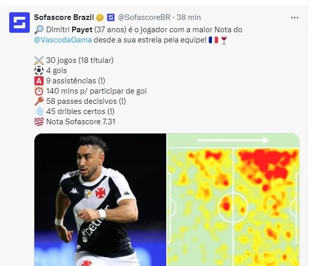 Dimitri Payet (37 anos) é o jogador com a maior nota do Vasco da Gama desde a sua estreia pela equipe!