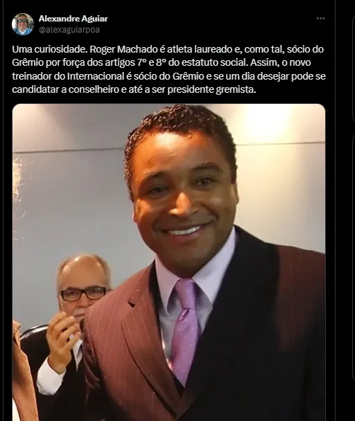 Uma curiosidade. Roger Machado é atleta laureado e, como tal, sócio do Grêmio por força dos artigos 7° e 8° do estatuto social. Assim, o novo treinador do Internacional é sócio do Grêmio e se um dia desejar pode se candidatar a conselheiro e até a ser presidente gremista.
