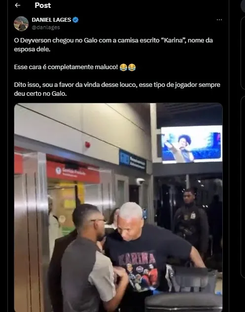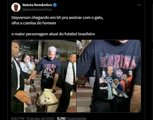 O Deyverson chegou no Galo com a camisa escrito “Karina”, nome da esposa dele.