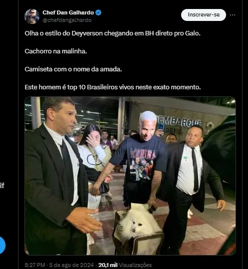 Após a chegada do atacante, os principais comentários foram como o atacante desembarcou no aeroporto. Vale lembrar que Deyverson chegou com uma camisa com o nome da esposa e com sua cachorrinha em uma sacola.