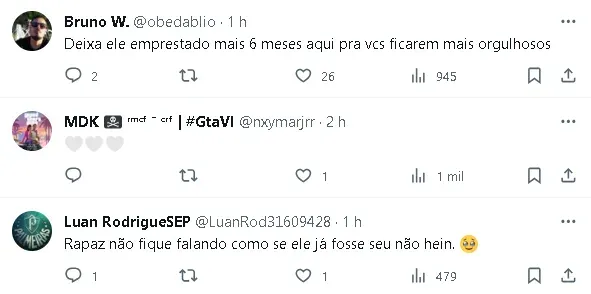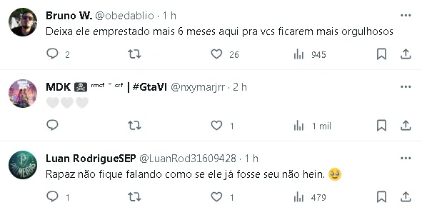 O time merengue expressou orgulho por Endrick, destacando seu papel no título consecutivo do Palmeiras. O jogador acumula quatro títulos como profissional no Alviverde, incluindo dois Campeonatos Brasileiros, uma Supercopa do Brasil e um Campeonato Paulista, todos conquistados em 2023.