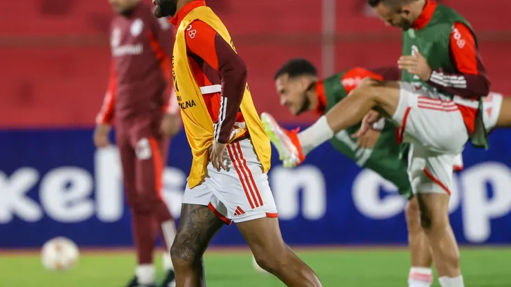 Os atletas Colorados já estão em campo realizando o trabalho de aquecimento.