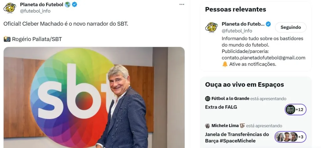 Há pouco, o SBT anunciou a contratação de Cleber Machado como narrador para se juntar a Téo José, que já comanda as transmissões de futebol da emissora de Silvio Santos há algum tempo. O jornalista vinha trabalhando nas transmissões do canal pago Amazon Prime Video.