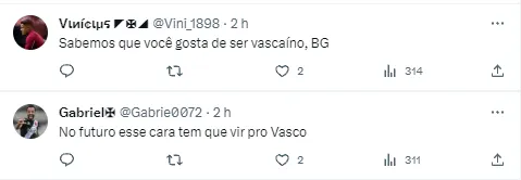 Foi a partir de uma entrevista para a TNT Sports que o volante ganhou um presente do Vasco. Depois de declarar que é torcedor da equipe, Bruno Guimarães ganhou uma camisa comemorativa do Gigante da Colina, postou nas redes sociais e agitou os cruz-maltinos. Os adeptos do time carioca pediram para o meio-campista vestir o uniforme da Cruz-Malta e deixar de lado as cores que vestia na infância.