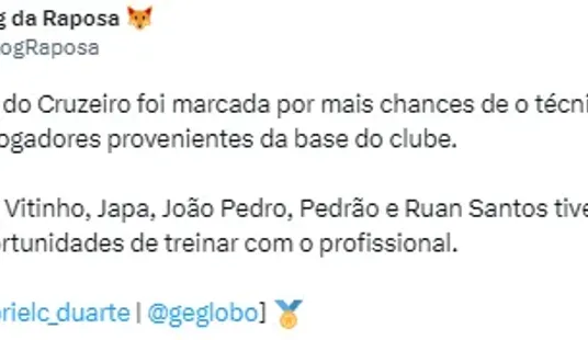 Com isso e com mais tempo para treinar durante as semanas, o técnico do Cruzeiro, Pepa pode ter reforços nas próximas partidas. Os jovens já tiveram novas oportunidades de treinar com o profissional e cabe a comissão técnica a opção pelos atletas.
