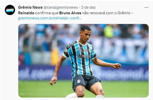 Segundo informações publicadas pelo jornalista JB Filho, em seu blog, o lateral-esquerdo Reinaldo deixou vazar que o zagueiro Bruno Alves irá deixar o Grêmio no fim do ano. Ele entregou que o companheiro não deve ficar para 2024.