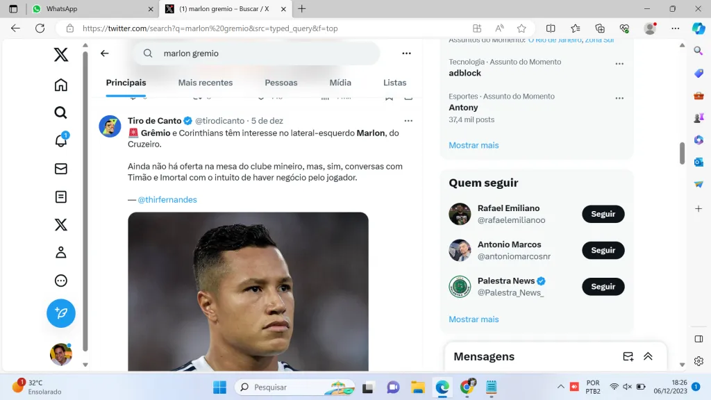 Trata-se de Marlon, do Cruzeiro. O Grêmio tem interesse no jogador de 26 anos, que possui contrato até dezembro de 2024. Os gaúchos esperam o término do Brasileiro para uma investida.