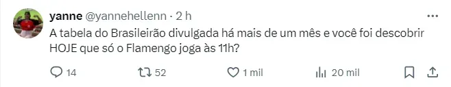 Em tom de crítica, pelo horário escolhido pela CBF para a partida entre Botafogo e Flamengo, o dirigente escreveu: “Hoje não teve jogo às 11:00? Qual é o critério para os times escolhidos neste horário? É quem grita que não joga? Muitas coisas precisam de explicação!”, postou Braz, questionando porque nenhum jogo da quinta rodada do Brasileiro também foi marcado para às 11h.