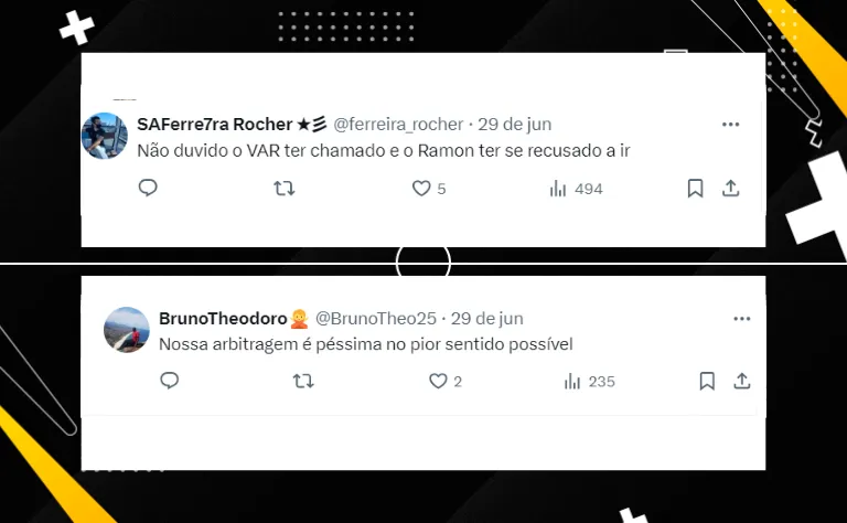 “É para expulsar esse lance do Hugo Moura no Tchê Tchê, vem por cima da linha da bola, atinge com força excessiva e com as travas da chuteira a canela do adversário e isso caracteriza jogo brusco grave pela regra e cartão vermelho. Falha gigante no campo e nem o VAR da CBF (corrigiu)”, escreveu.