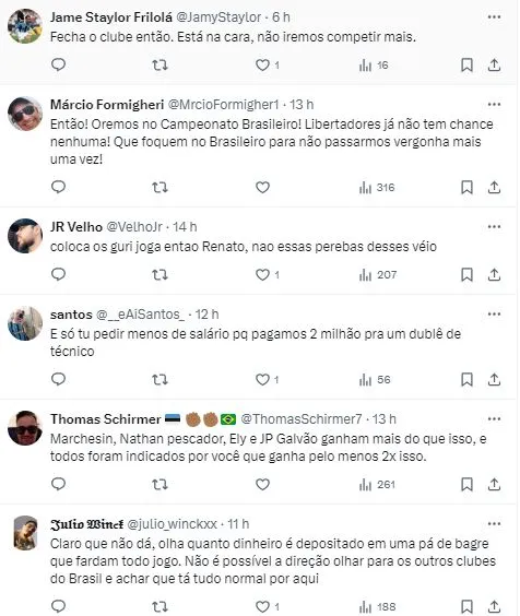 “Ninguém gosta de perder. Perdemos em casa na Libertadores, o que não poderia acontecer. Tem coisas que eu sei que estão acontecendo, mas isso converso com meu presidente, o vice, meu executivo. Mas não vamos fazer tempestade num copo d’água. Primeiro tempo não jogamos bem e no segundo tempo melhoramos. Vocês viram, mais uma vez, um erro de arbitragem. Tem certas coisas que fico quieto e prefiro conversar com pessoas do clube”.