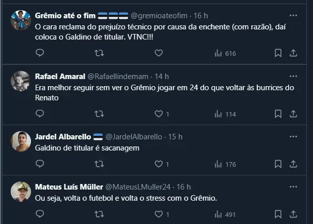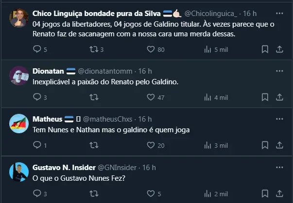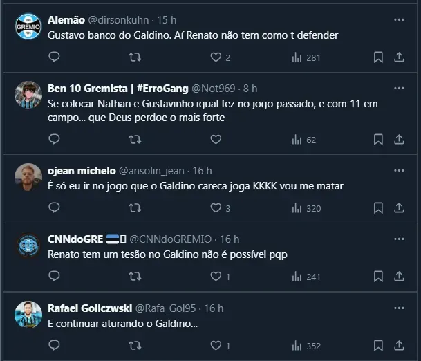 Posto isso, mesmo com inúmeros torcedores pedindo a presença dos jovens Gustavo Nunes e Nathan Fernandes, Galdino deve ser mesmo o escolhido para a função do argentino e o tema causou polêmica entre gremistas.