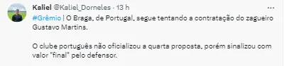 “O Braga, de Portugal, segue tentando a contratação do zagueiro Gustavo Martins. O clube português não oficializou a quarta proposta, porém sinalizou com valor final pelo defensor”, trouxe Kaliel Dorneles.