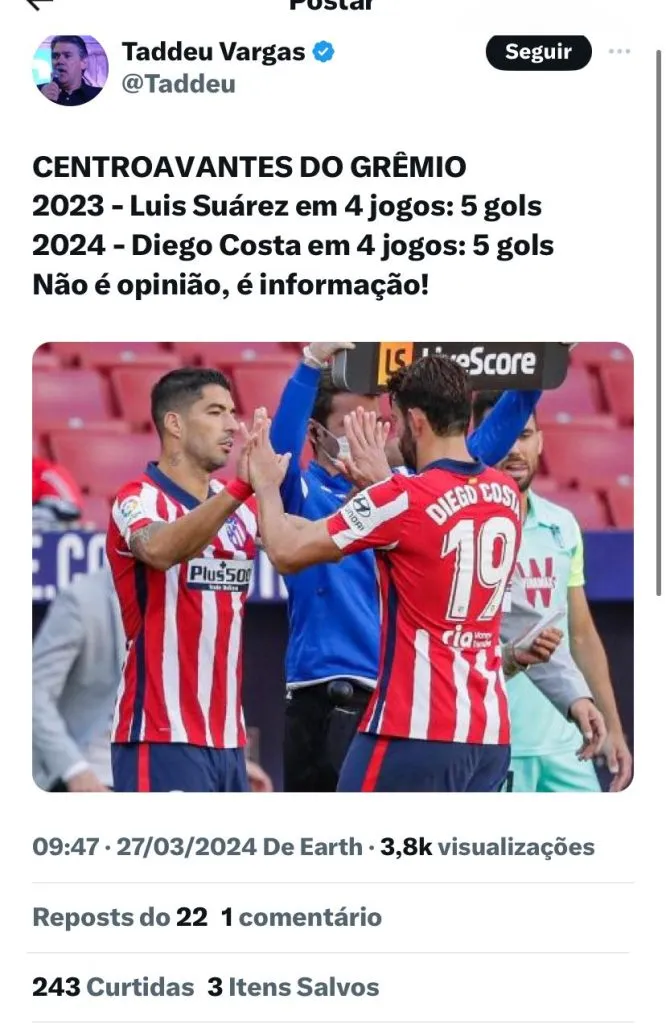 Renato é sincero sobre a artilharia de Diego Costa no Grêmio: "Pago para fazer gols"