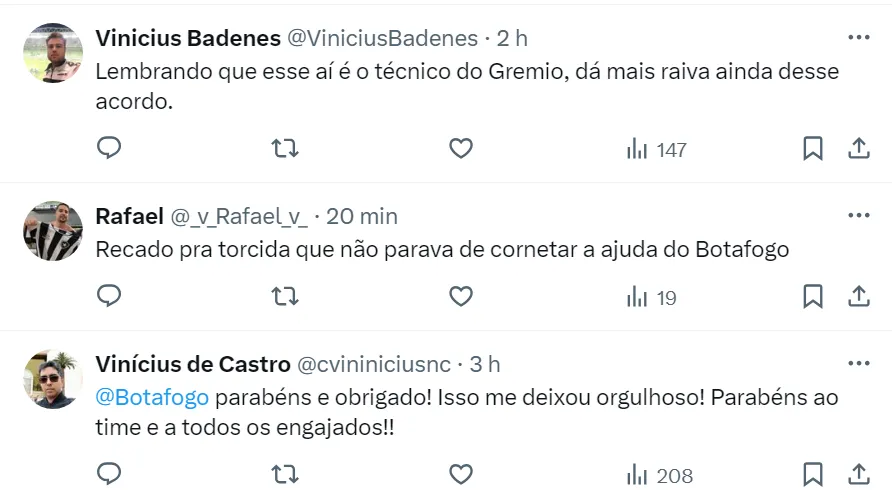 No entanto, o treinador elogiou a postura do Alvinegro: “Claro que cada presidente pode tomar a decisão que bem entende, mas nessa horas vimos quem era quem. O Botafogo, por exemplo, que é do Rio, fechou com o Grêmio. Viu o que estávamos passando. Estou falando um”, afirmou.