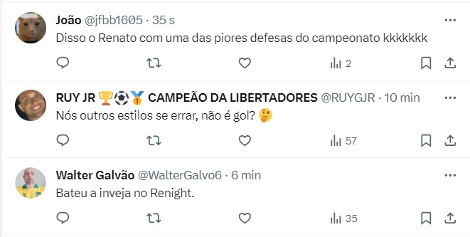 “E o estilo que o time dele joga, o adversário já sabe, então o adversário sempre vai armar uma arapuca para roubar essa bola, e tem acontecido bastante isso, e eles tem tomado gols, ou tem sofrido ameaças. Então, é o que eu falo! Fez, deu certo, é bonito! Errou? Perdeu o jogo”, concluiu Renato.