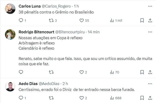 “Cara, eu vou te falar uma coisa. Vou te falar sinceramente, se eu fosse chamado para a Seleção agora, eu não iria. Com todo o respeito”. Questionado pelo jornalista sobre a possível recusa, Renato complementou.
