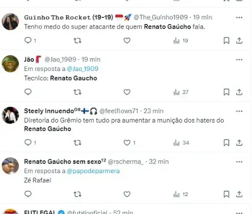 Durante a coletiva de imprensa, Renato Gaúcho falou que o Grêmio está esperando respostas de novos reforços. O treinador disse que, se forem positivas, entre terça-feira ou quarta-feira o clube já deve anunciar.