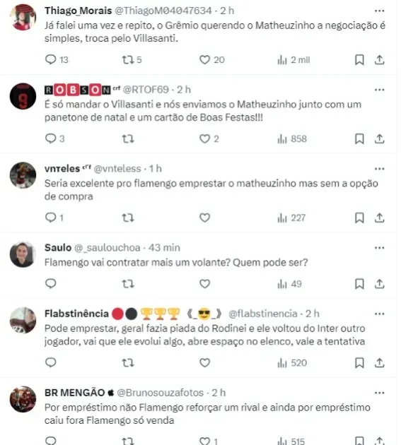 “#Gremio tem interesse na contratação de #Matheuszinho, lateral-direito do #Flamengo por empréstimo de uma temporada! O jogador que é agenciado pelo empresário #GiulianoBertolucci, vem recebendo inúmeras sondagens para sair do rubro-negro carioca!“, escreveu no X, antigo Twitter.