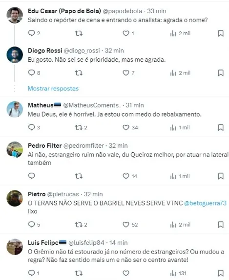 “O Grêmio iniciou conversas com o volante uruguaio Gabriel Neves, do São Paulo, que tem possibilidade de estar ficando livre no mercado“, escreveu o jornalista no X, antigo Twitter.