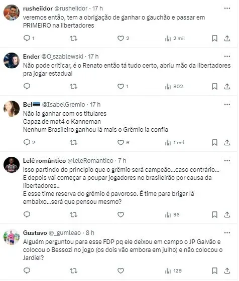 Obviamente, a torcida gremista também se manifestou de maneira bastante negativa, com reclamações enfáticas nas redes sociais, inclusive, com uma lista de dispensas de atletas que deve ser executada pela direção do Clube.