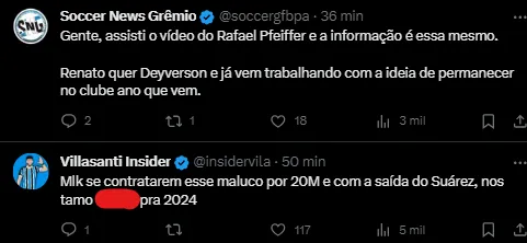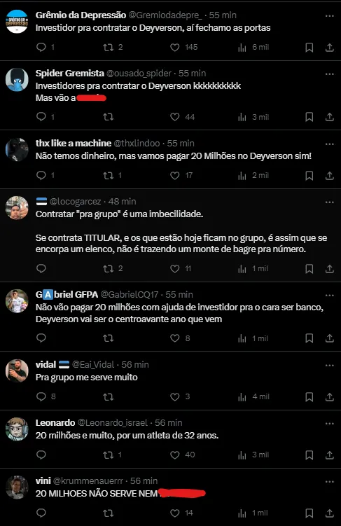 Contudo, o comentário foi apagado após gerar repercussão entre os torcedores, aumentando as especulações sobre sua saída do clube. Há um interesse mútuo entre Deyverson e o Grêmio, mas a negociação enfrenta um empecilho devido à multa rescisória estipulada em R$ 20 milhões para clubes brasileiros.