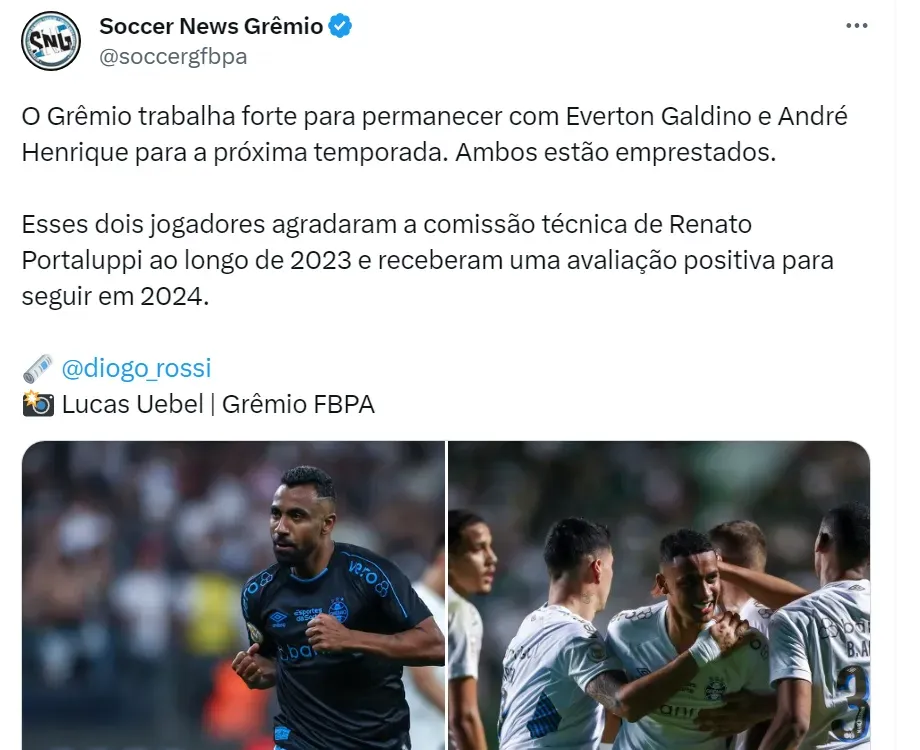 De acordo com informações obtidas pelo jornalista Diogo Rossi, os atacantes Everton Galdino e André Henrique agradaram a comissão técnica de Renato Portaluppi e podem permanecer no Clube Gaúcho para a próxima temporada. Para isso acontecer, a direção do Grêmio vai precisar contratá-los em definitivo. Os dois jogadores estão emprestados ao Tricolor até dezembro.