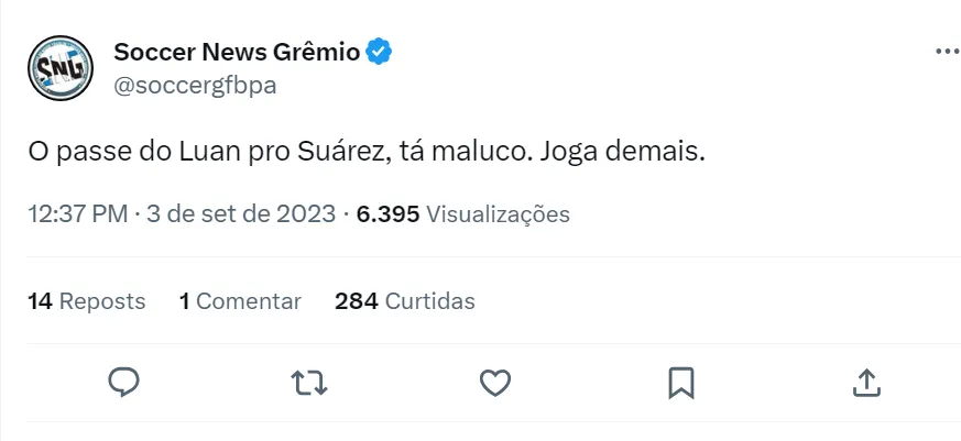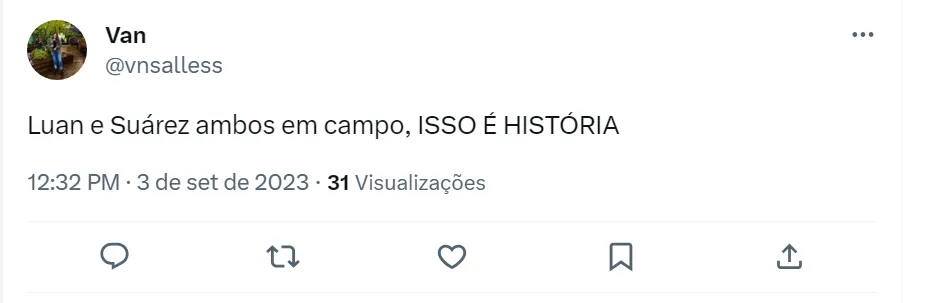 O meia Luan entrou no lugar do argentino Cristaldo e, o desejo dos torcedores do Tricolor Gaúcho, é ver em campo os dois juntos, formando trio de ataque com Luis Suárez: “Um dia talvez eu veja Cristaldo – Luan – Suárez em campo. Até lá terei que aguentar o nosso Sterling (João Pedro) e Galdino jogando com o uruguaio”, disse um gremista. Queria ver o Luan jogando com o Cristaldo e com o Suarez, mas pelo jeito não vai rolar”, disse outro torcedor no Twitter.