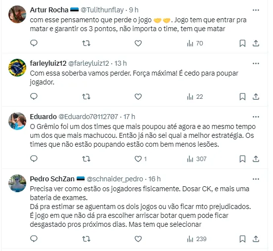 Apesar do foco na Copa Libertadores da América, o entendimento é que a equipe não pode se descuidar no Campeonato Brasileiro, e por isso o comandante gremista ainda deve mandar a campo alguns titulares.