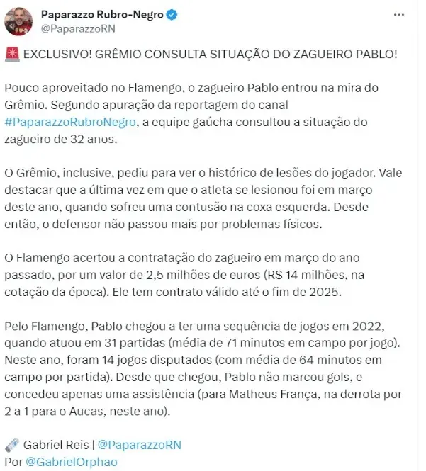 O zagueiro Pablo entrou na mira do Grêmio. Segundo apuração da reportagem do canal Paparazzo Rubro-Negro, a equipe gaúcha consultou a situação do zagueiro de 32 anos.