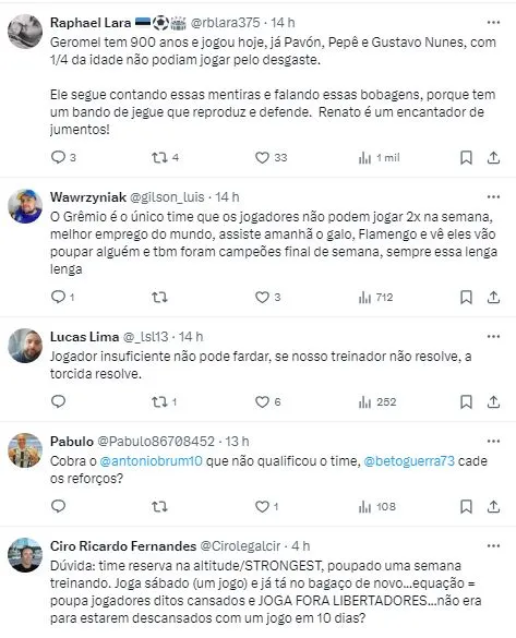 Obviamente, a situação ligou o alerta na caserna gremista e o técnico Renato Portaluppi, em entrevista coletiva após o duelo, elencou os motivos para ter poupado atletas. O treinador foi bastante criticado pelos Tricolores, e rebateu as cobranças.