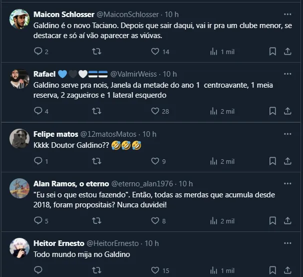 “O torcedor pode ficar tranquilo. Não só quando eu coloco o Doutor Galdino em campo, mas quando eu coloco A, B ou C, eu sei o que eu estou fazendo. É sempre para o melhor do time“, disse.