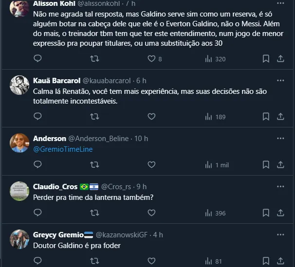 Entretanto, o “recado” de Renato aos torcedores causou certa divisão e gerou polêmica entre os gremistas. Enquanto alguns defenderam a fala do técnico, outros mantiveram as críticas ao atacante.