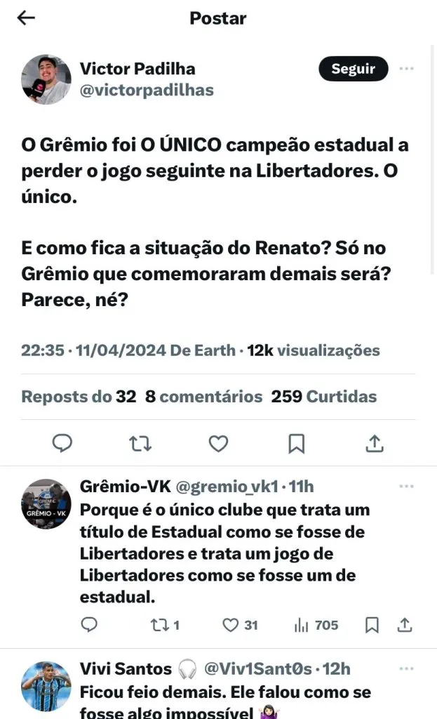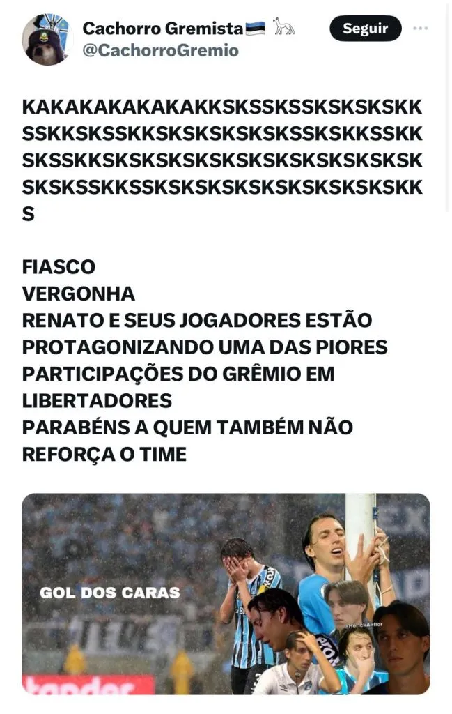 Atualmente, o Grêmio está na lanterna do seu grupo e o líder soma 4 pontos somados. O próximo desafio do torneio será somente no dia 23, contra o Estudiantes, em La Plata. Para respirar aliviado, ao menos um ponto precisa ser conquistado fora de casa. Após a derrota, Renato justificou o ‘start’ ruim da sua equipe na competição e foi bem sincero.