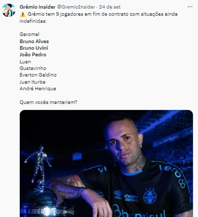 Além de reforços, outra situação que vem sendo observada é sobre jogadores do elenco que estão em fim de contrato com o Tricolor Gaúcho. O plantel do Imortal tem alguns jogadores que terão seus contratos acabando no fim do ano. Com isso, a situação deles vêm sendo observada.