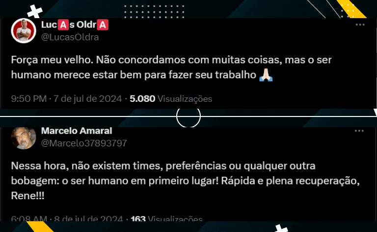 Já no hospital, o jogador se manifestou através das redes sociais buscando tranquilizar os torcedores diante do ocorrido. “Galera, quero agradecer a todas as mensagens e passar para avisar que está tudo bem comigo, graças a Deus. Estamos juntos”, escreveu Renê.