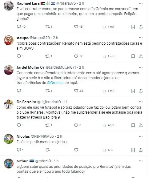 Renato quer reforços para que o time dispute a Libertadores de maneira competitiva. “A informação que tenho é que a negociação está aberta, segue a espera de uma definição do Grêmio e a busca de reforços na Libertadores é a grande questão”, afirmou Muller.