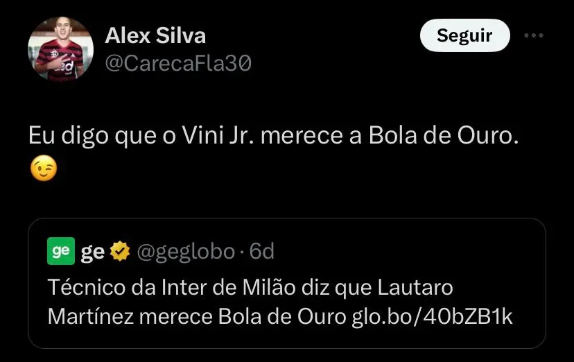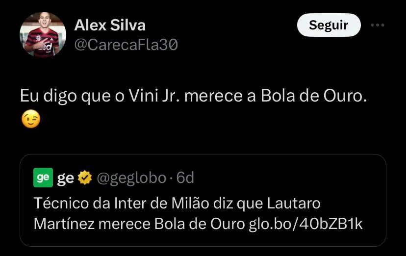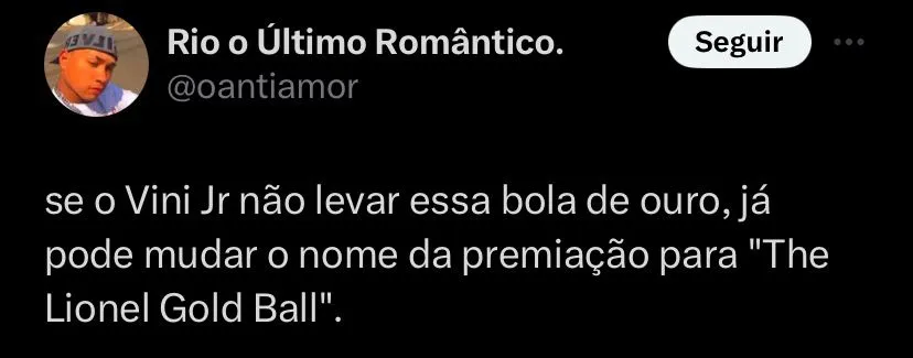 Vale uma menção honrosa para Vini Jr, o único brasileiro indicado para o prêmio, mas que certamente não será o ganhador, já que Messi é o grande favorito a vencer pela oitava vez, após conquistar o título da Copa do Mundo de 2022 com a Argentina.
