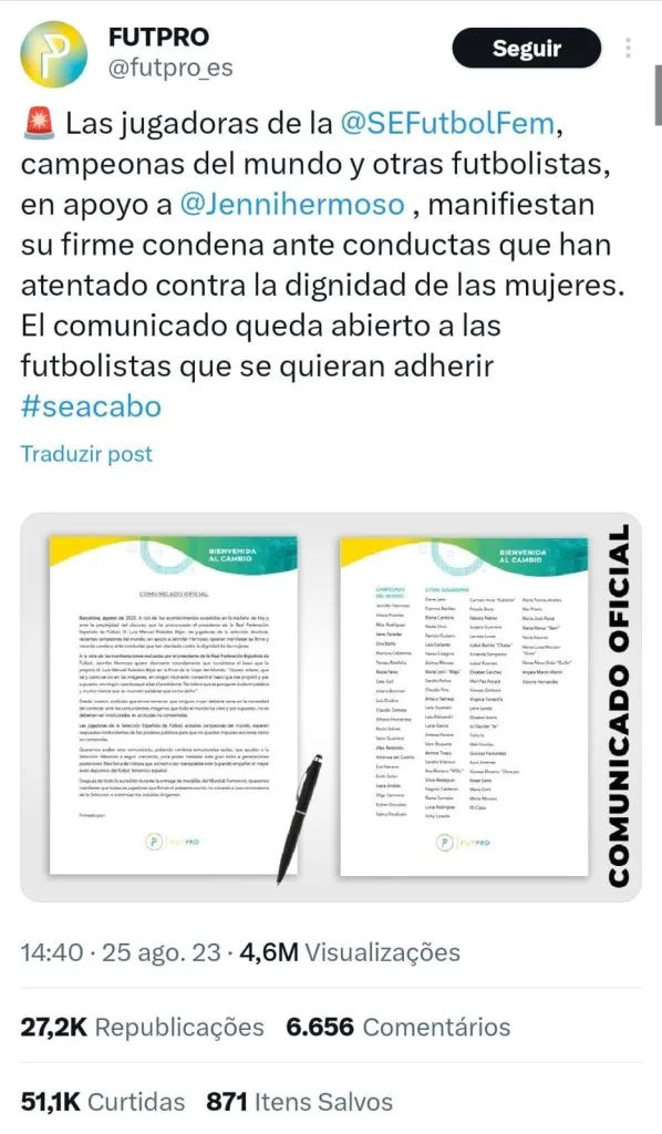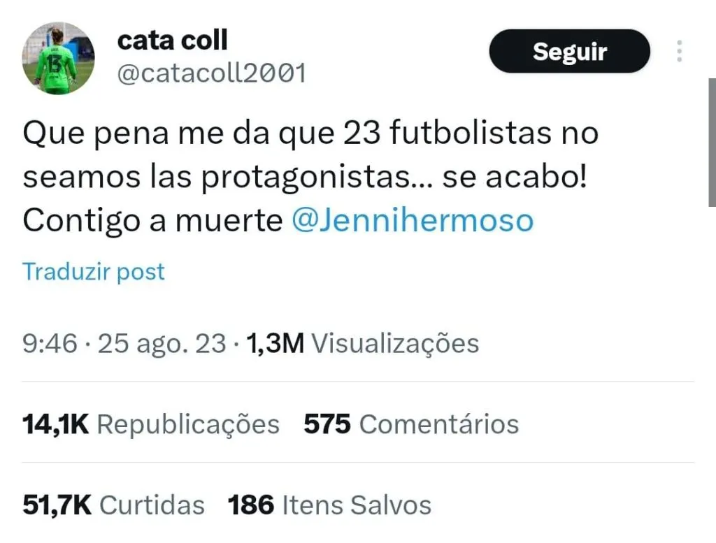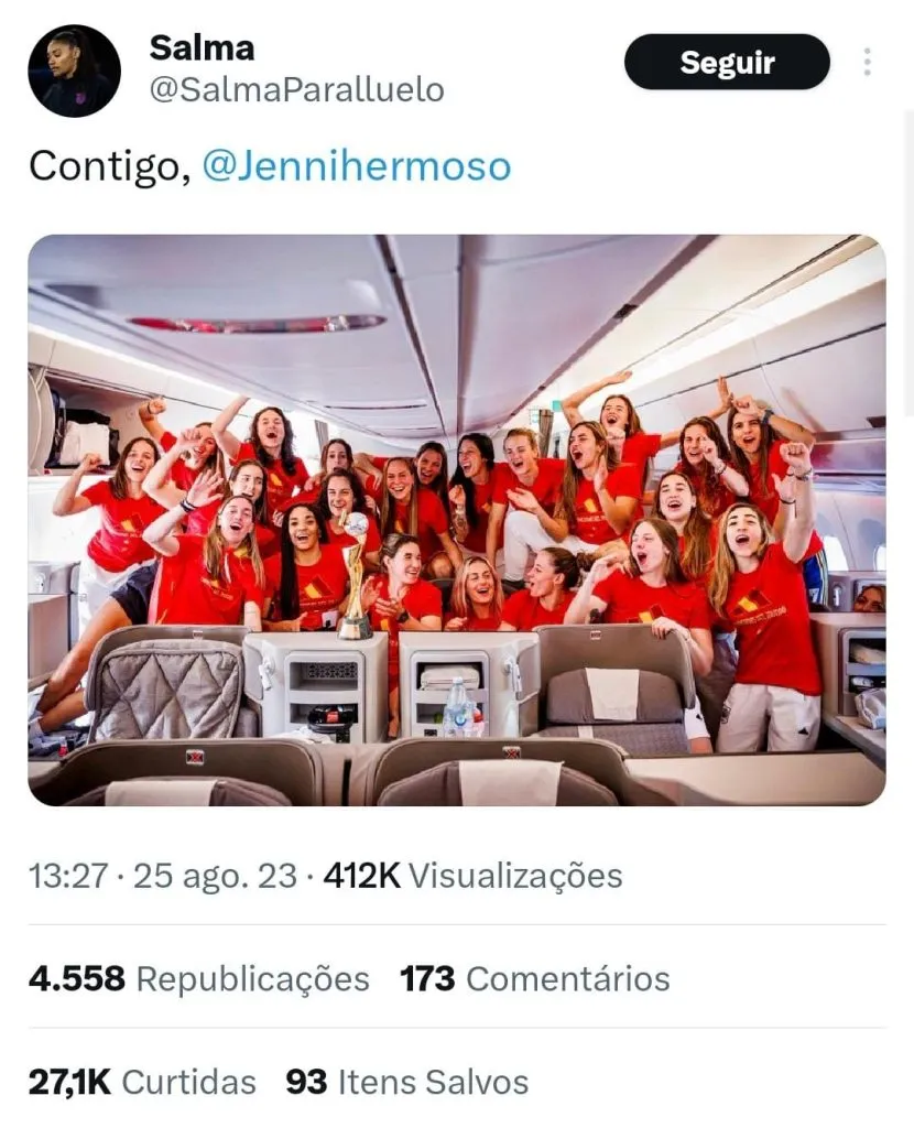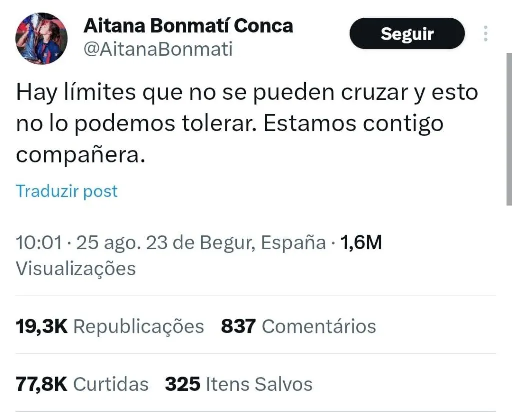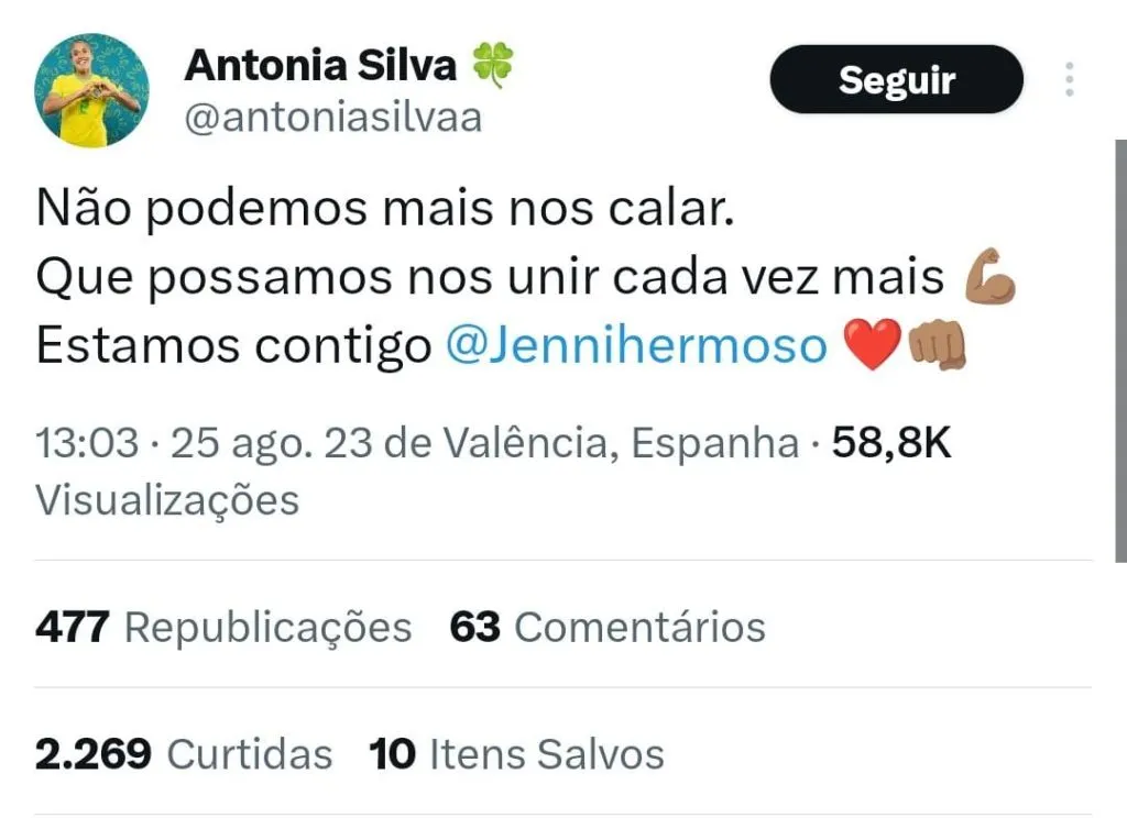Diante do cenário, a atacante espanhola de 33 anos, passou a receber apoio de diversos jogadores e clubes. Entre os que decidiram se manifestar em apoio a Hermoso, está a zagueira da Seleção Brasileira e clube espanhol Primera División Levante UD, Antônia, que não ignorou o caso. “Não podemos mais nos calar. Que possamos nos unir cada vez mais 💪🏽 Estamos contigo @Jennihermoso ❤️👊🏽”, postou a brasileira usando seu perfil no Twitter.