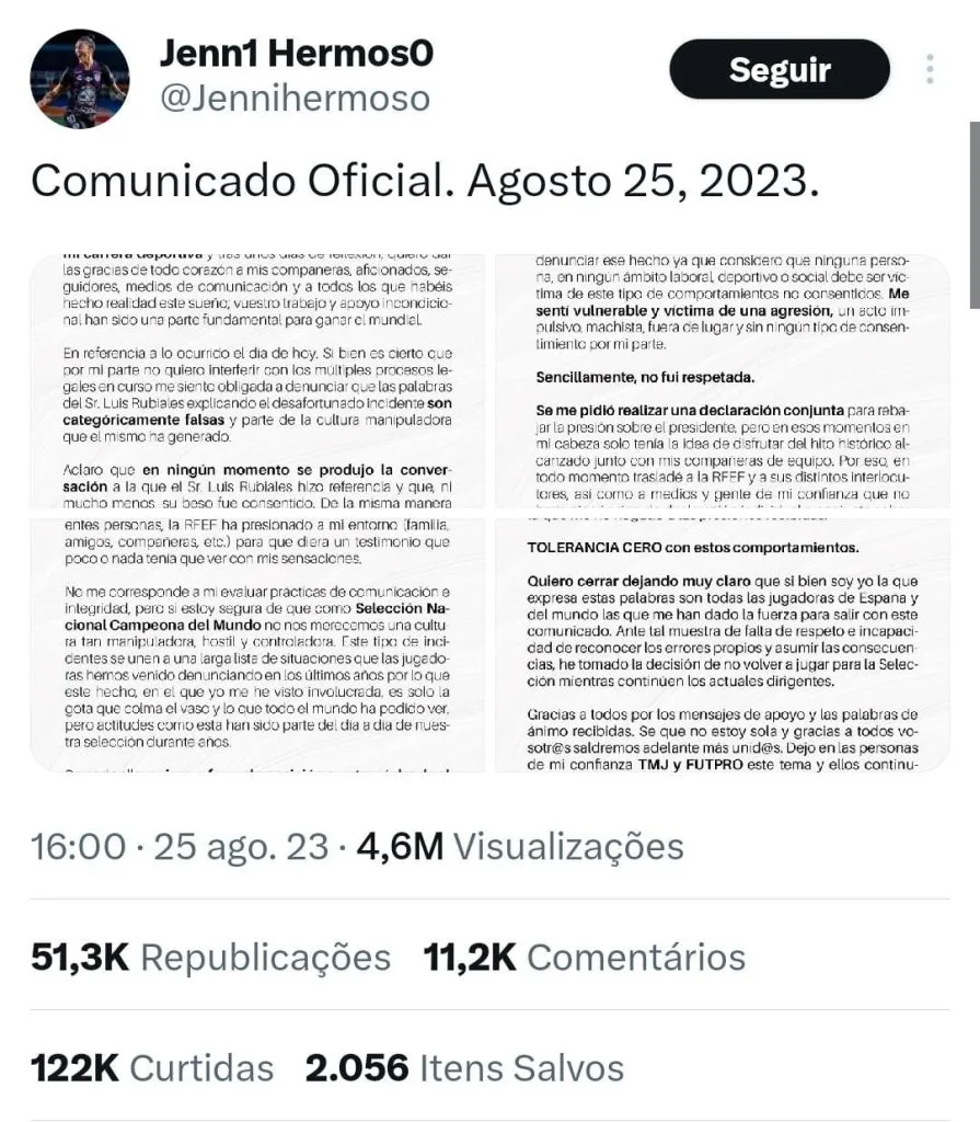 Após receber diversas críticas, Luis Buiales afirmou que não iria renunciar ao cargo e que o bejio dado em Hermoso não continha desejo, e ainda que “foi um beijo espontâneo, mútuo e eufórico. E, acima de tudo, consentido”, algo que foi desmentido pela jogadora. “Quero esclarecer que, tal como visto nas imagens, em nenhum momento consenti o beijo que ele me deu. Não tolero que coloquem em dúvida minha palavra, muito menos que se inventem palavras que eu não disse”, esclareceu Jenni em comunicado.