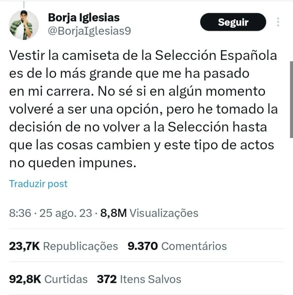 Nomes como Putellas, Aitana Bonmatí, Sergio Roberto, De Gea e Casillas, se posicionaram contra a permanência de Rubiales na presidência da RFEF. Barcelona, Real Madrid e o presidente da La Liga também se manifestaram. O posicionamento mais forte veio de em um comunicado jogadoras da seleção espanhola em que anunciaram um boicote a futuras convocações no caso da permanência “dos atuais dirigentes” da federação do país.