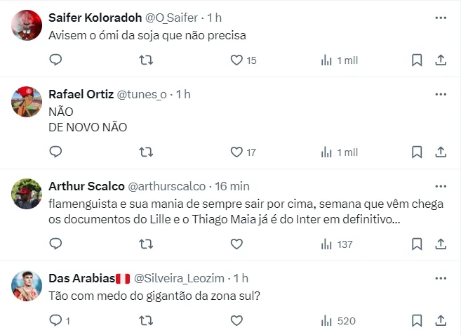 Nas redes sociais, o Inter por sua vez, já apresentou o jogador à torcida. Em quatro posts dedicados a nova contratação, um deles mostra os títulos conquistados na carreira de Thiago Maia.
