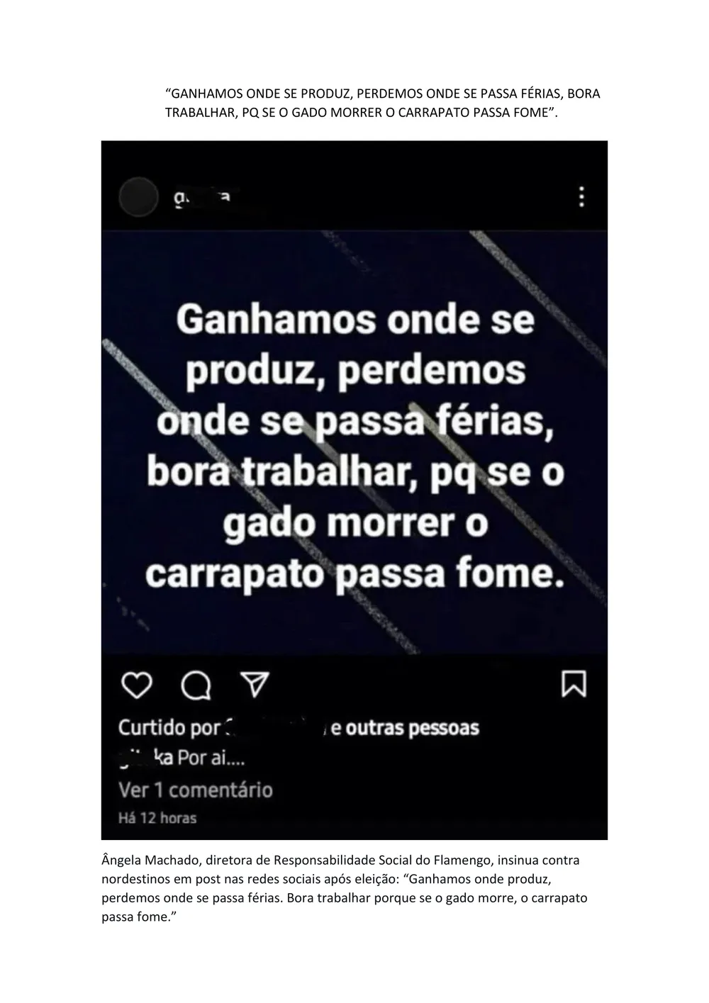 Apoiadora de Bolsonaro, a diretora flamenguista não se segurou após os resultaods do último doming (30) e usou o seu Instagram pessoal para destilar ataques ao povo do nordeste:”Ganhamos onde produz, perdemos onde se passa férias. Bora trabalhar porque se o gado morre, o carrapato passa fome”. — A publicação viralizou rapidamente, por mais que ela tenha trancado o perfil, prints foram tirados e compartilhados, o que gerou ainda mais confusão.
