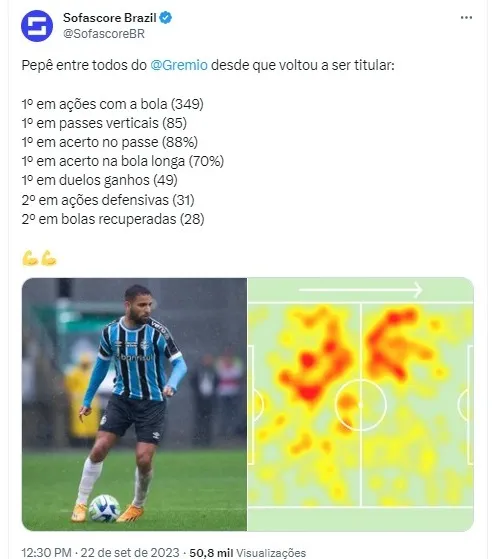 Na bola longa, também é o primeiro da equipe com 70% de aproveitamento. Em duelos ganhos, foram 49, Já em ações defensivas, Pepê é o segundo, com 31 interceptações. Já no quesito bolas recuperadas, foram 28 e o atleta também está na 2ª colocação. Entretanto, ainda sim, Pepê vem realizando boas atuações com a camisa gremista e os números comprovam.