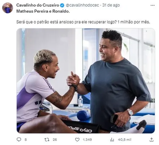 Matheus Pereira chegou no Cruzeiro em julho de 2023, no entanto, teve pouco tempo para atuar com o Manto Celeste, já que se lesionou no dia 8 de agosto, em duelo contra o Botafogo, apresentando lesões nos ligamentos cruzado posterior e colateral medial do joelho esquerdo. Ele não precisou passar por cirurgia, porém, completa um mês longe dos gramados.