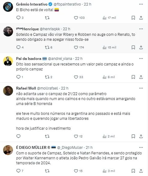 Campaz, desta forma, teve seu contrato com o Grêmio reativado e o vice-presidente de futebol do Tricolor, Antônio Brum, se posicionou sobre o futuro do jogador, que até então, estava fora dos planos para a temporada de 2024.
