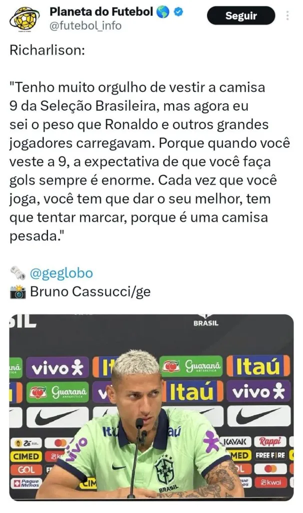 “Tenho muito orgulho de vestir a camisa 9, mas agora eu sei o peso que o Ronaldo carregava e que outros grandes jogadores que vestiram a camisa carregavam. Porque quando você veste o número 9, a expectativa de que você faça gols sempre é enorme. Cada vez que você joga, você tem que dar o seu melhor, tem que tentar marcar, porque é uma camisa pesada de vestir.”, esta foi a declaração de Richarlison em coletiva pela Seleção Brasileira.