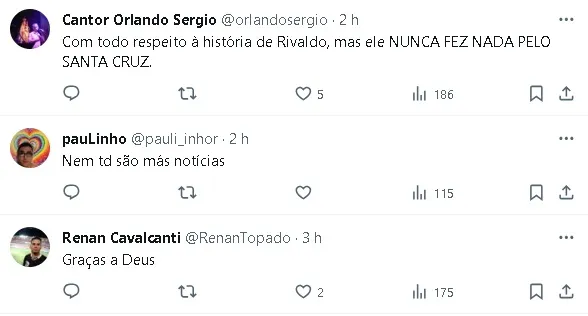 “Estou à disposição para ajudar caso alguém me chame. Tanto eu como o Grafite, como o Ricardo Rocha, pessoas que fazem parte da história do Santa Cruz, todos estão querendo ajudar“, concluiu Rivaldo, que planeja retornar ao Recife na segunda metade de janeiro.