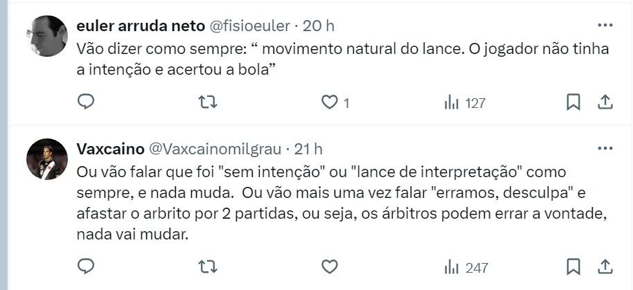 “Não sei como vão justificar isso… O cidadão levou uma bica nas partes baixas!”, respondeu o jornalista do Grupo Globo na rede social do X. O jogador rubro-negro acertou o corpo de Galdames sem bola, mas Claus nada marcou.