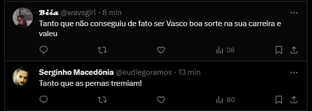 Robson Bambu também agradeceu pela oportunidade de atuar pelo Vasco. Nos comentários, antigos companheiros de time retribuíram o carinho. No Nice, o zagueiro possui contrato até junho de 2025.