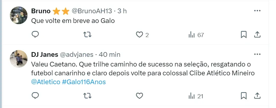 “Se tornou o clube do nosso coração, que tem uma torcida fantástica, extremamente apaixonada. E também os parabéns a toda a diretoria, atletas, funcionários, torcedores, principalmente os novos donos da SAF do Galo”, afirmou. Emocionado, o dirigente também falou do atual momento do Alvinegro e aposta que o clube vai colher os frutos pela boa gestão.